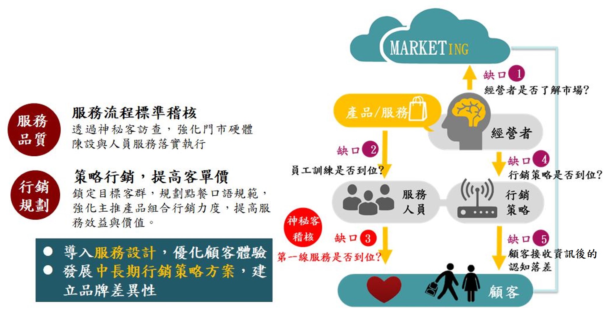 - 「消極面」論,了解同仁對於公司服務規範的落實程度,又可促使其於現場操作中,保有一定的服務態度。反向思考,上述兩點亦可增進積極的效益。